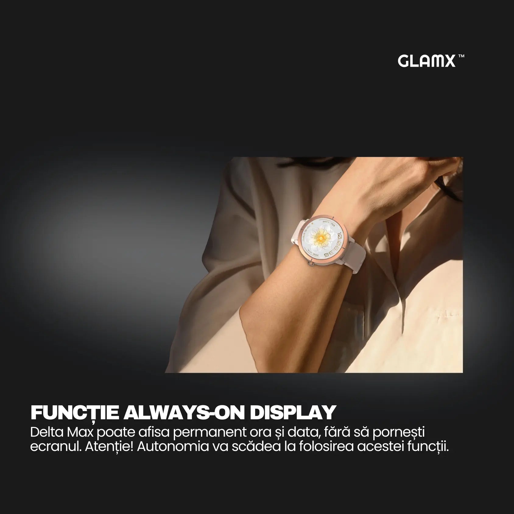DA. Designul carcasei de 1.32" a fost ales special pentru a se potrivi elegant pe o încheietură feminină, fără a fi masiv.