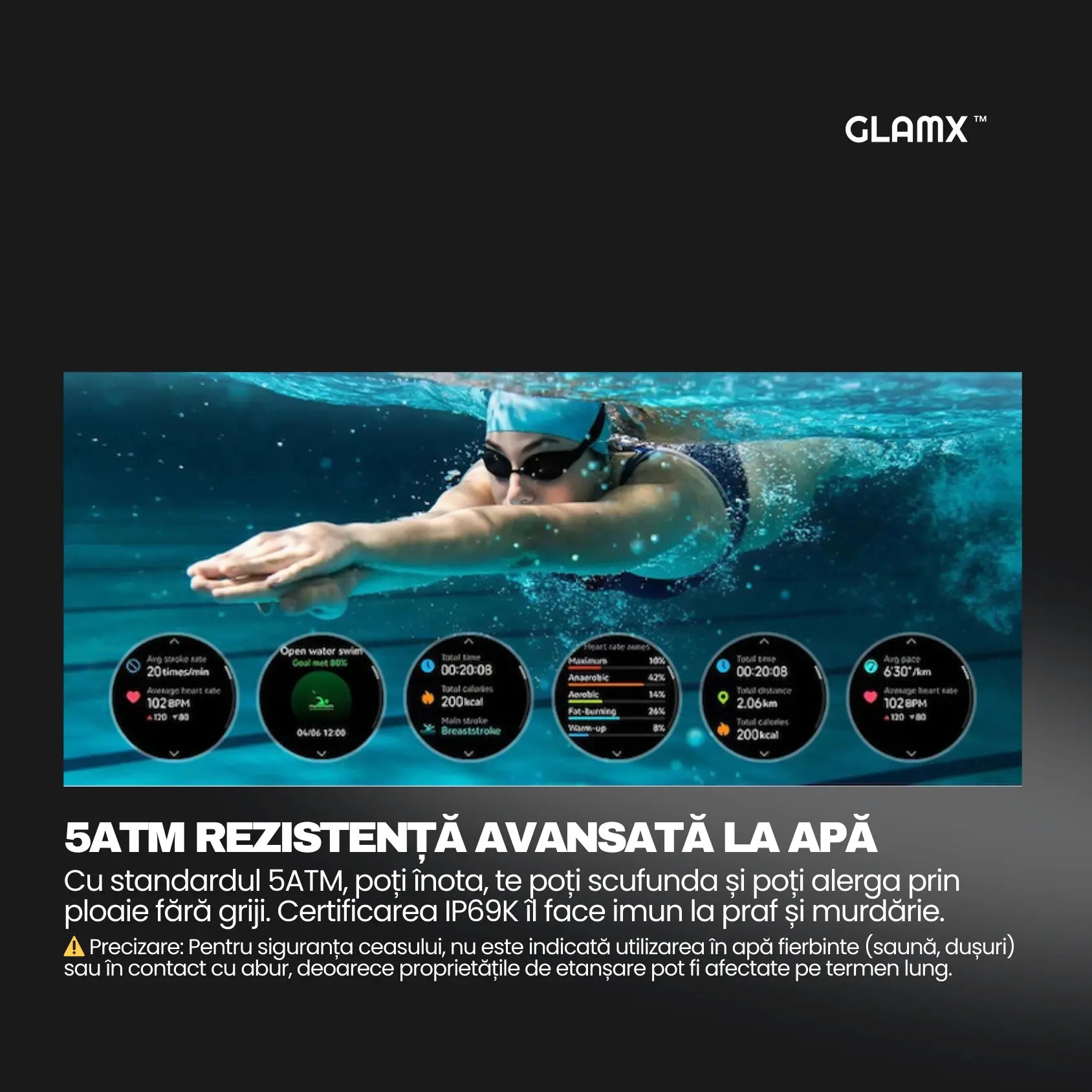 Rezistență Apă 5 ATM (50m) - Monitorizare avansată înot (SWOLF).