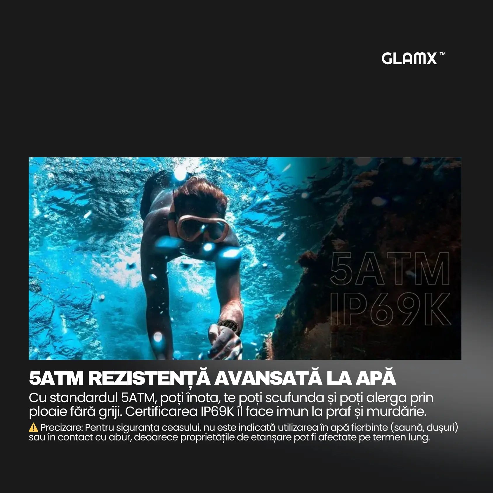 5ATM (potrivit pentru inot, ploaie - fara probleme!)